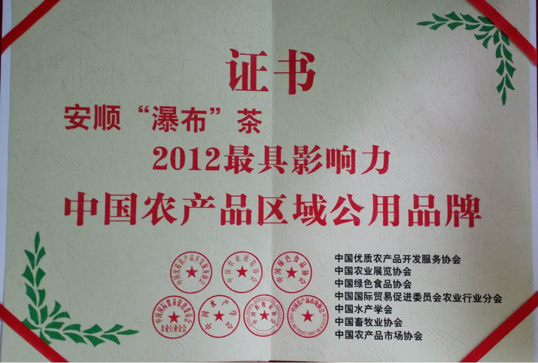 榮譽資質(zhì) 安順“瀑布”茶2012最具影響力中國農(nóng)產(chǎn)品區(qū)域公用品牌