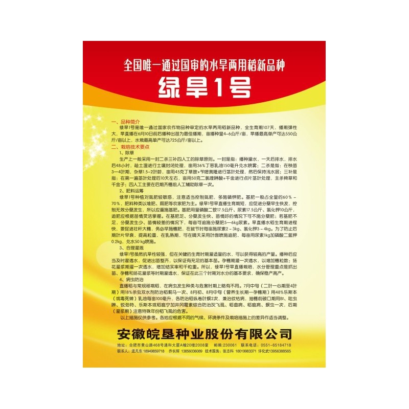 【風險提示】:種子應儲藏在低溫(25℃以下)、干燥(相對濕度70%以下)及通風處;種子調運后及時做好防潮、防濕、防蟲、防鼠等工作并在上述條件下進行儲藏,做到在安全儲藏條件下、質量保證期內規范安全用種;請遵照當地農技部門做好科學栽培,做好稻瘟病、稻曲病、紋枯病、白葉枯、條紋葉枯病、黑條矮縮病、螟蟲、稻飛虱等病蟲害的綜合防治工作,由于栽培措施不當和病蟲害及氣候等因素造成的一切損失責任自負;按審定適宜種植區域種植,超區域銷售或種植造成的損失責任自負,公司概不負責;根據種植季節結合當地合理安排播期,規避因高低溫、風暴倒伏等人為不可抗逆因素造成的損失。