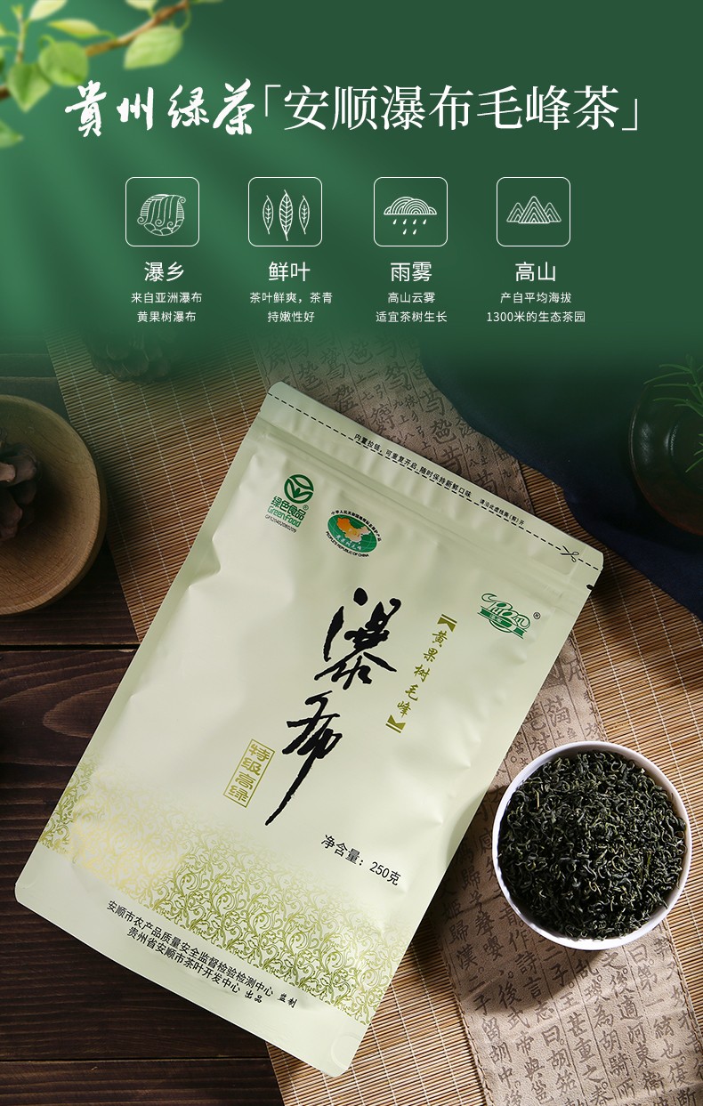 瀑布茶品牌是安順市人民政府主打茶葉品牌,省級重點打造區域公共品牌,屬貴州五大名茶,先后獲得獲“中國農產品區域公用品牌”、“貴州省著名商標”、“貴州省名牌產品”等榮譽稱號。近年來,在各級部門大力推動下,瀑布茶品牌不斷發展壯大。截止目前,現有瀑布茶品牌加盟企業23家,輻射茶園面積200000余畝,其中綠色食品認證茶園基地面積7000余畝,有機食品認證基地面積2500畝。擁有“瀑布毛峰”、“瀑布翠芽”“瀑布紅茶”、“瀑布翠龍”等產品,多次獲得“中綠杯”、“中茶杯”、“華茗杯”大獎;分別榮獲14屆中國國際農產品交易會金獎、18屆中國綠色食品博覽會金獎“黃山杯”首屆全國傳統名茶產品質量特別金獎、安順十大旅游商品等殊榮及稱號。