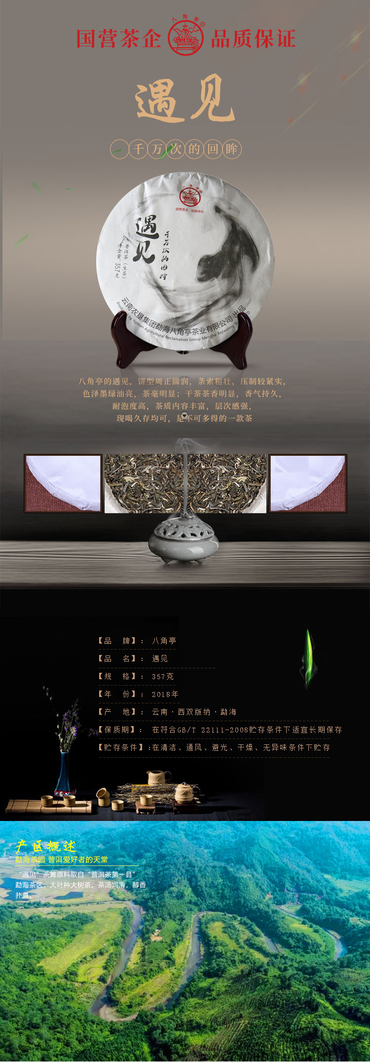 云墾茶業(yè)集團(tuán)下屬茶葉生產(chǎn)企業(yè)——云南農(nóng)墾集團(tuán)勐海八角亭茶業(yè)有限公司原名黎明茶廠,是我國歷史最為悠久的茶企之一,曾位列“中國普洱茶十大知名品牌”“十大最受歡迎茶葉品牌”、“中國普洱茶十大暢銷品牌”中,成為今天市場上最有影響力的品牌之一。公司產(chǎn)品獲得“綠色食品”、ISO9001、 HACCP和云茶品牌(YC)4項(xiàng)認(rèn)證,連續(xù)獲得“云南名牌農(nóng)產(chǎn)品”“云南名牌產(chǎn)品”“云南省著名商標(biāo)”等品牌榮譽(yù),公司生產(chǎn)的多款普洱茶在歷次專業(yè)評比中多次獲得特等金獎(jiǎng)和金獎(jiǎng)。在2018第五屆中國企業(yè)五星品牌論壇上,云南農(nóng)墾集團(tuán)勐海八角亭茶業(yè)有限公司上榜中國普洱茶行業(yè)影響力品牌——“金芽獎(jiǎng)”,公司負(fù)責(zé)人陳勝軍先生獲“陸羽獎(jiǎng)”,被授予2017“國際十大杰出茶人”榮譽(yù)稱號。