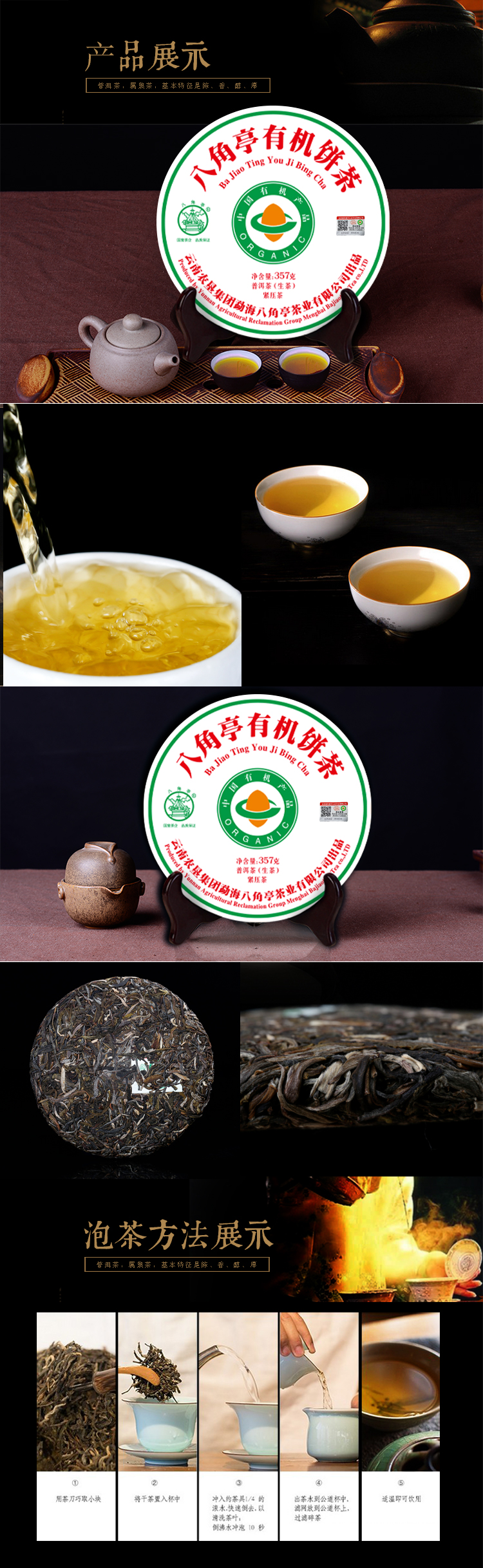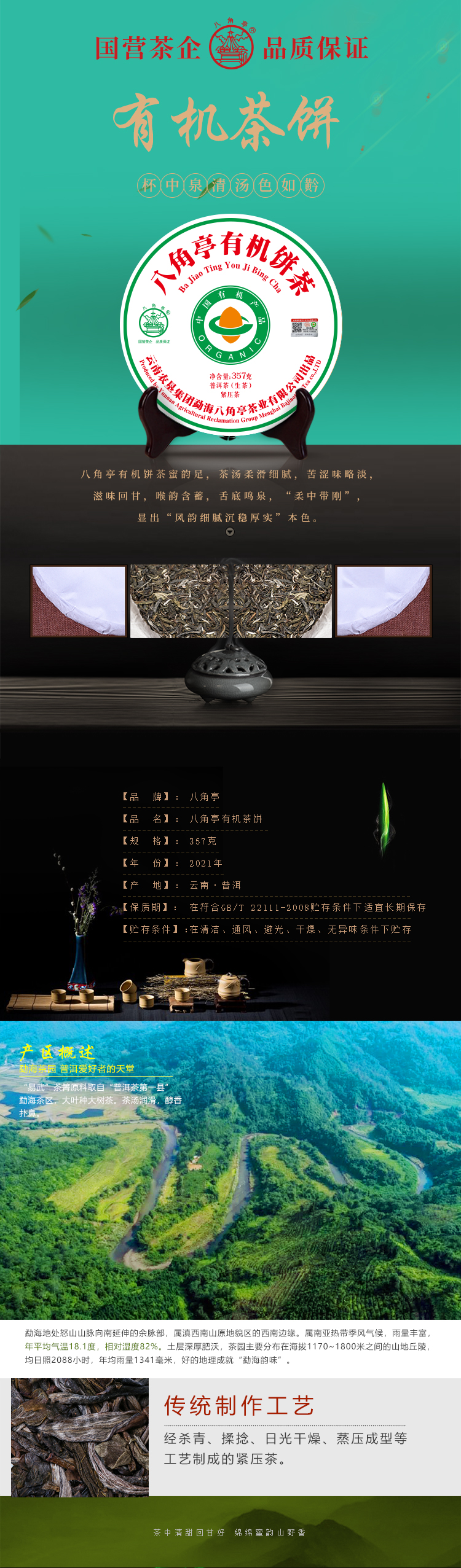云墾茶業(yè)集團(tuán)下屬茶葉生產(chǎn)企業(yè)——云南農(nóng)墾集團(tuán)勐海八角亭茶業(yè)有限公司原名黎明茶廠,是我國歷史最為悠久的茶企之一,曾位列“中國普洱茶十大知名品牌”“十大最受歡迎茶葉品牌”、“中國普洱茶十大暢銷品牌”中,成為今天市場上最有影響力的品牌之一。公司產(chǎn)品獲得“綠色食品”、ISO9001、 HACCP和云茶品牌(YC)4項(xiàng)認(rèn)證,連續(xù)獲得“云南名牌農(nóng)產(chǎn)品”“云南名牌產(chǎn)品”“云南省著名商標(biāo)”等品牌榮譽(yù),公司生產(chǎn)的多款普洱茶在歷次專業(yè)評比中多次獲得特等金獎和金獎。在2018第五屆中國企業(yè)五星品牌論壇上,云南農(nóng)墾集團(tuán)勐海八角亭茶業(yè)有限公司上榜中國普洱茶行業(yè)影響力品牌——“金芽獎”,公司負(fù)責(zé)人陳勝軍先生獲“陸羽獎”,被授予2017“國際十大杰出茶人”榮譽(yù)稱號。