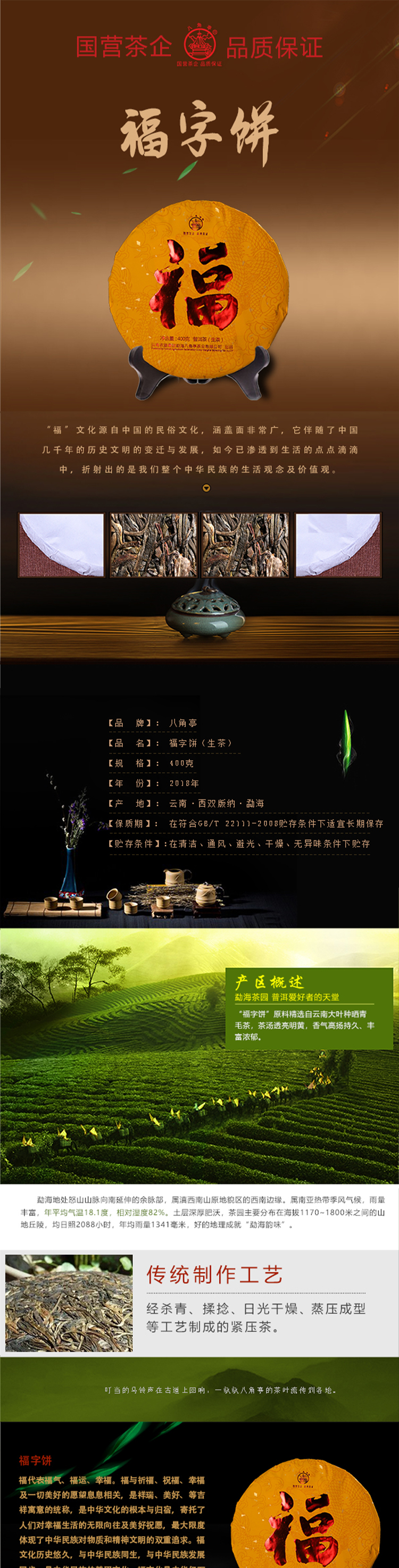 ??——八角亭茶業(yè)公司:經(jīng)營方式為生產(chǎn)加工、銷售,主營普洱茶、緊壓茶、兼營毛茶收購。目前以生產(chǎn)、加工、銷售“八角亭”系列普洱茶為主,是云南省農(nóng)業(yè)產(chǎn)業(yè)化龍頭企業(yè)。“八角亭”商標獲得云南省著名商標,“八角亭”牌普洱茶榮獲云南省名牌產(chǎn)品和云南省名牌農(nóng)產(chǎn)品。已先后通過工業(yè)生產(chǎn)許可證、ISQ9001與HCCP認證、云茶牌認證(YC)等項工作,在歷次專業(yè)評比中“八角亭”普洱茶多次獲得特等金獎和金獎。2017年5月,“八角亭”牌老班章茶葉獲得了有機茶資格認證。八角亭茶業(yè)公司多次進行了技術(shù)改造,現(xiàn)已建立了標準化生產(chǎn)車間和設(shè)備,年設(shè)計生產(chǎn)量達3000噸,是整個公司的主體核心企業(yè)。