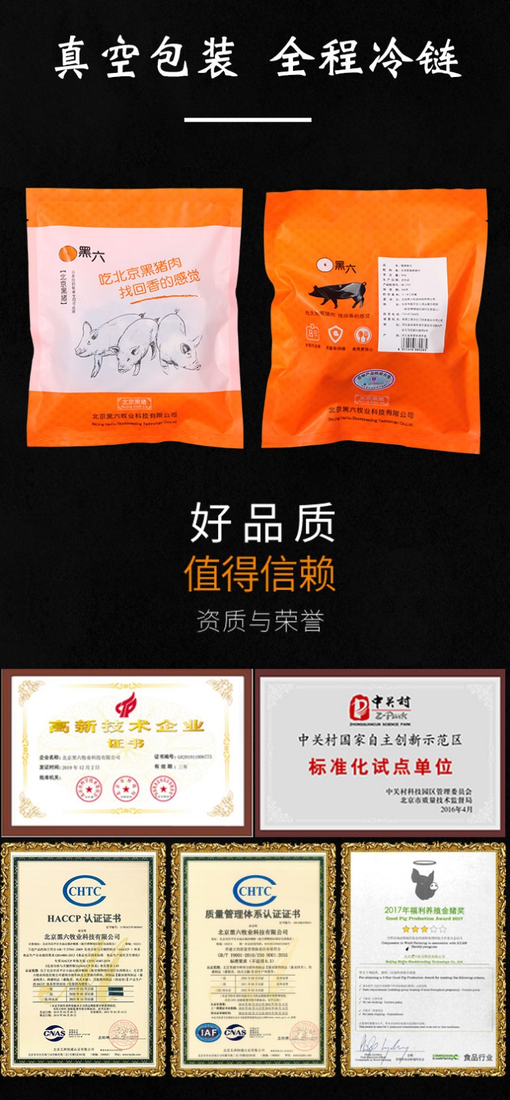 公司利用北京黑豬自有知識產權,通過科技支撐,建立了從基地到餐桌的安全、優質食用農產品加工的全程可追溯體系,“黑六”高品質豬肉受到廣大消費者關注和接受。隨著北京黑豬全產業鏈的延伸和發展,公司獨創的“黑六”品牌日益受到消費者青睞。“黑六”產品通過超市專賣、直銷、電商、餐飲等渠道步入了千家萬戶。被淡忘和追尋的肉嫩味美的北京黑豬肉通過黑六團隊的精心打造,再度成為消費者舌尖上的享受、餐桌上的靚麗一景。